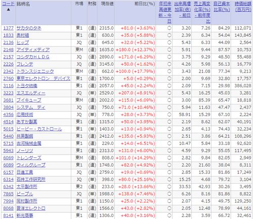 ◆スクリーニング条件 ①前営業日年初来高値更新 ②前日より出来高が2倍以上増加 ③時価総額15億円以上 ④売上高変化率が前年度比3%以上 ⑤自己資本比率20%以上 今週のスクリーニングの結果は以下になります。 対象銘柄は27銘柄でした。 何と言っても「コシダカ…