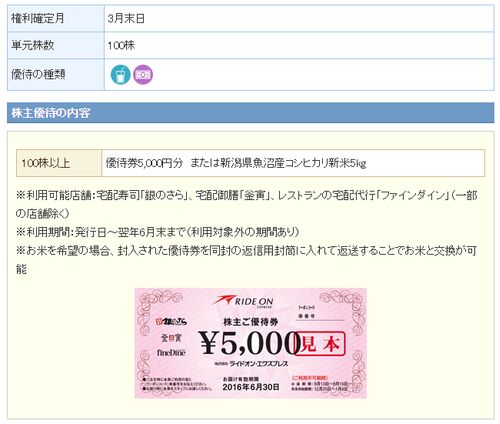 ライドオン・エクスプレス(6082) すしの「銀のさら」や釜飯「釜寅」が主力。調理済み食材の宅配を全国展開。 PER19.47、PBR4.00、配当利回り0.73% 株主優待制度は以下の通りです。 市場:東証1部 信用貸借区分:信用 分売価格:1,344円 前営業日終値:1,3…
